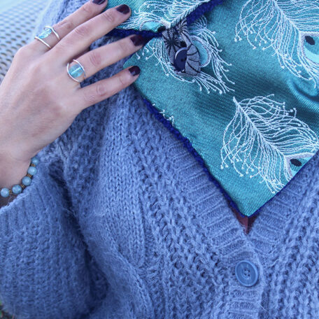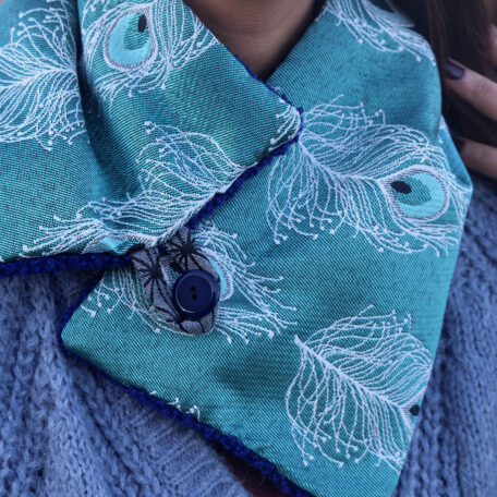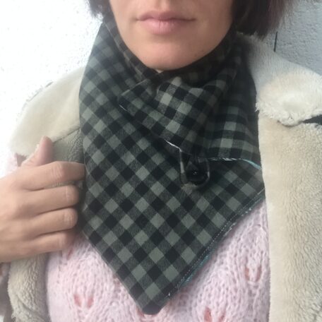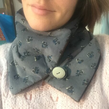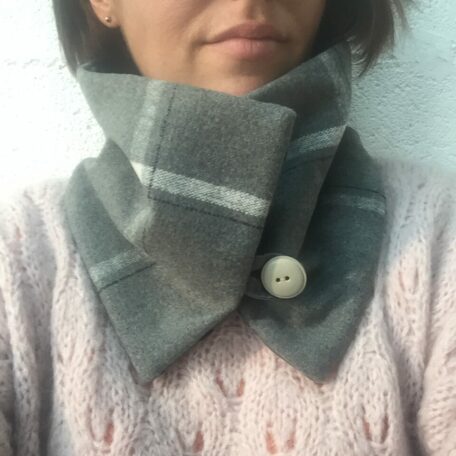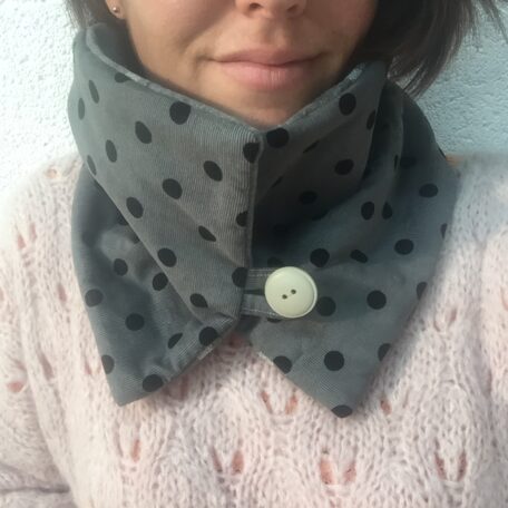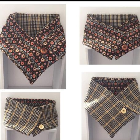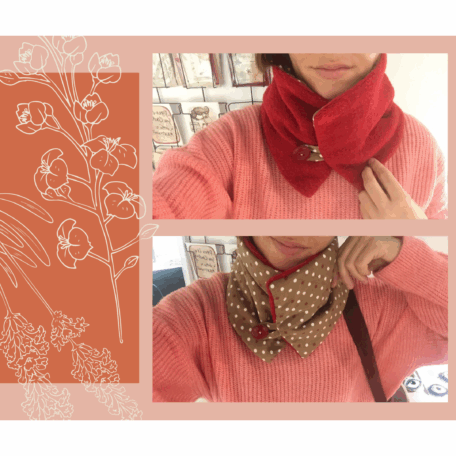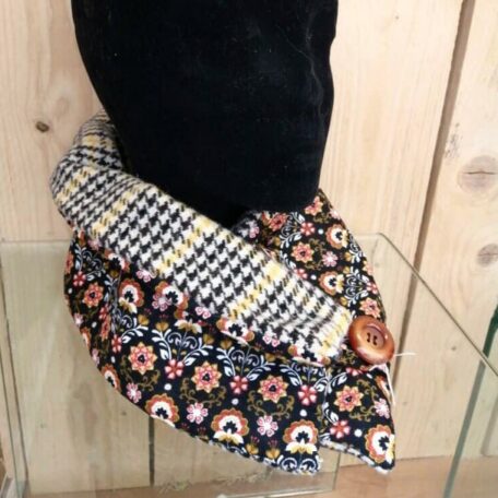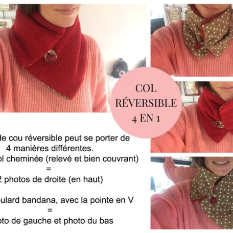 Col tour de cou réversible en lainage, fait-main, pouvant se porter de 4 manières différentes. Il et doublé de ouate pour un confort optimal.