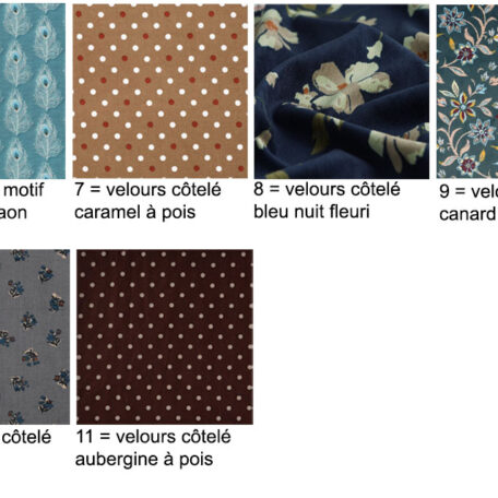 7 = velours côtelé caramel à pois (coton) visible porté sur l’image des 4 formes possibles