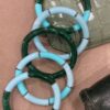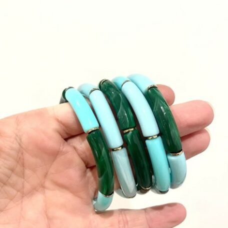 Bracelet élastique en perles d’acétate mix bleu et vert, ainsi que des perles dorées en hématite.