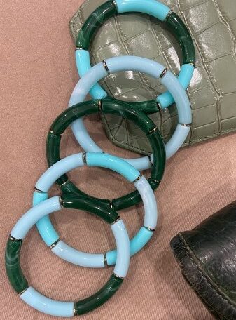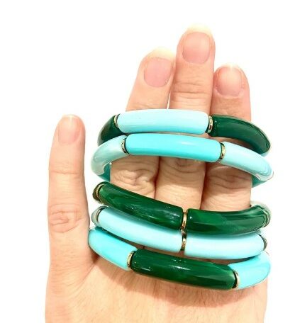 Apportez une touche de fraîcheur et d’élégance à votre poignet avec ce jonc élastique en résine, décliné dans de magnifiques tons bleu glacier et vert foncé. Inspiré par les nuances de l’océan et de la nature, ce bracelet tube en résine allie sobriété et modernité.