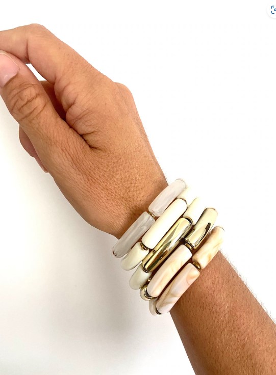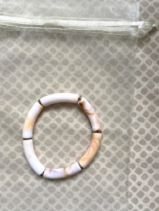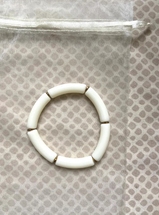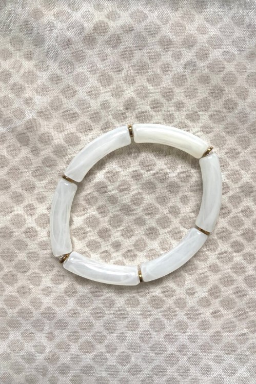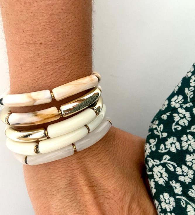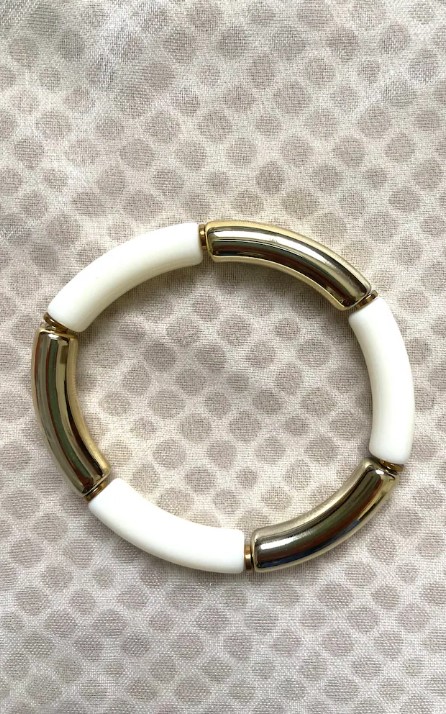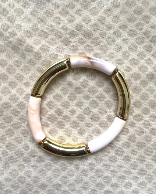 Bracelet élastique en perles d’acétate mix blanc et doré, associées à des perles dorées en hématite.