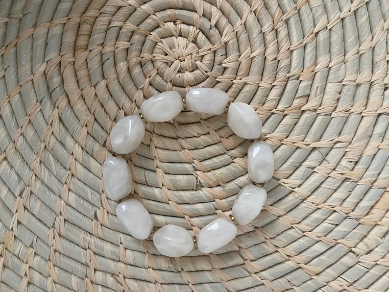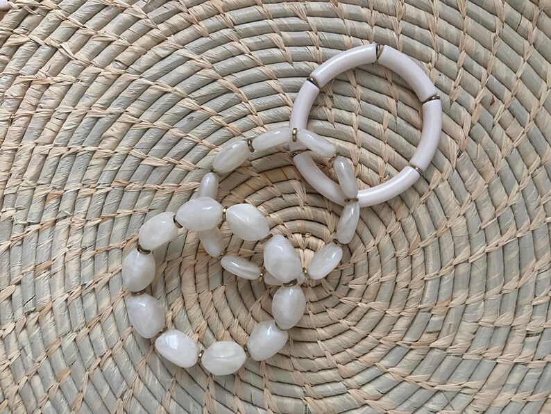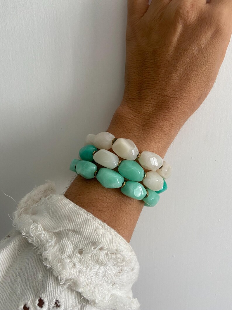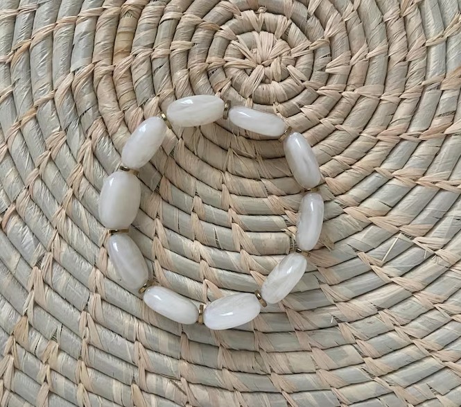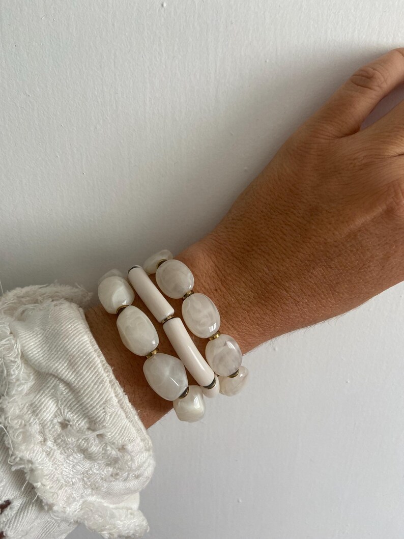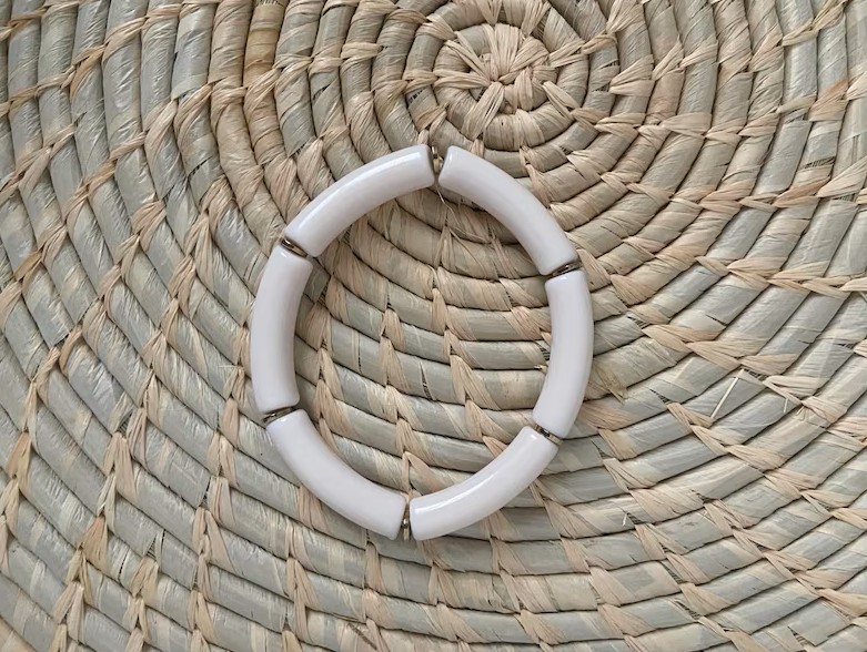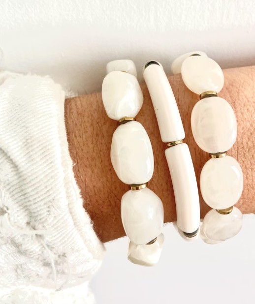 Ce bracelet en résine élastique blanc nacré ou crème est idéal pour apporter une touche chic à tous vos looks. Du plus minimaliste au plus bohème. Il se porte aussi bien en hiver qu’en été.
