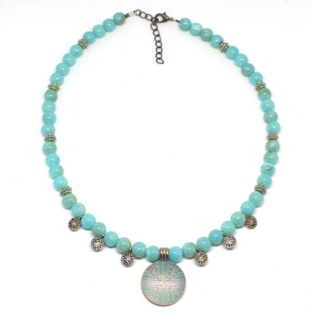 Collier court ethnique composé de perles de verre et agrémenté de breloques en métal