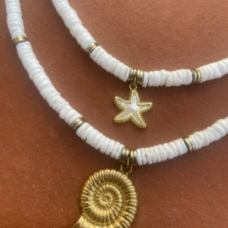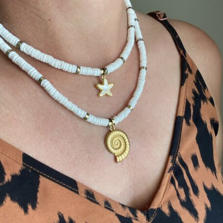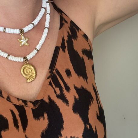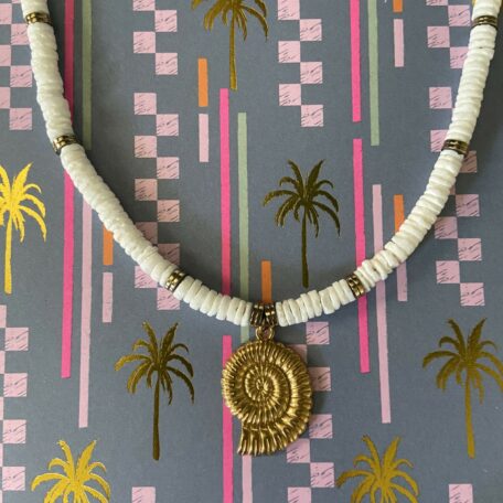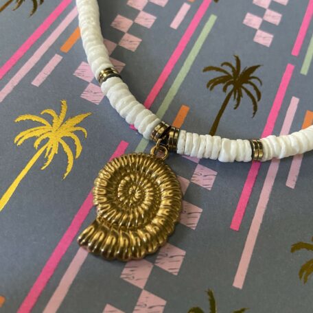 Il est composé de perles de coquillages heishi aux teintes naturelles, et sublimé par un médaillon doré ultra tendance en forme d’ammonite, symbole mystique de croissance et de protection dans les cultures ancestrales.