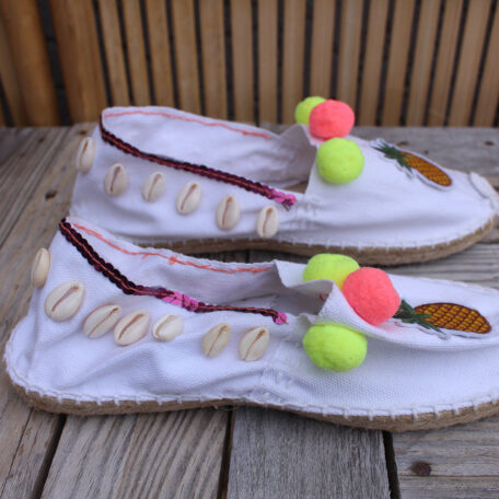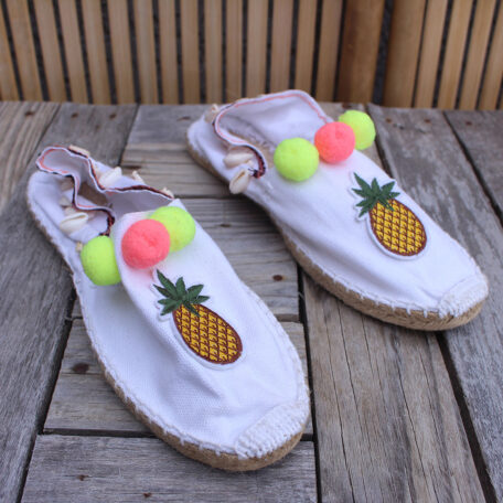 Ecusson en forme d’ananas cousu à la main sur l’espadrille.