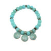 Médailles ethniques en métal argenté teinté de touches turquoises, dont les deux faces sont différentes (petits points sur une face et stries verticales sur l’autre)