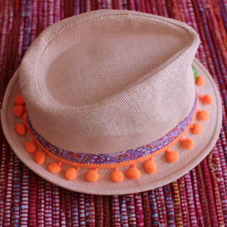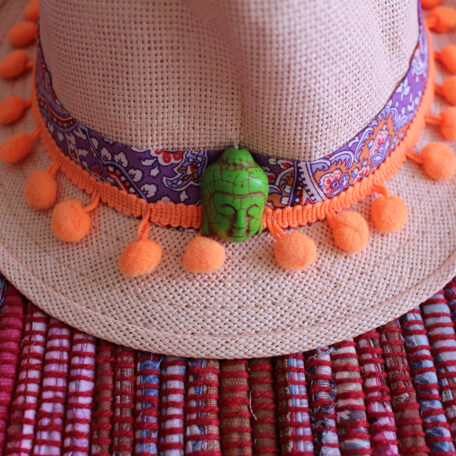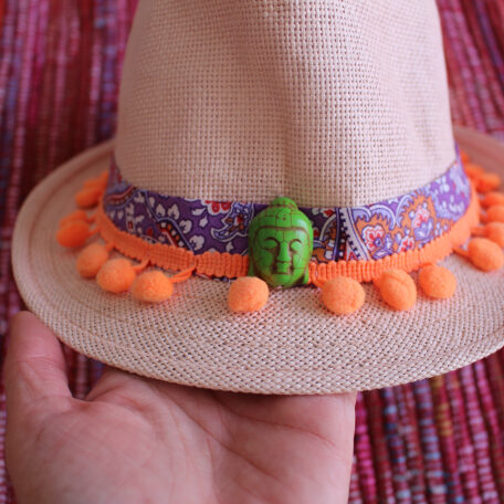 Chapeau d’été customisé avec un galon en coton motif cachemire, des pompons oranges fluos et un bouddha en pierre d’howlite teinté de couleur verte.