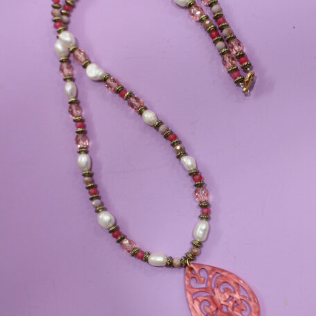 Collier type sautoir baroque avec perles de verre à facettes et perles de culture.